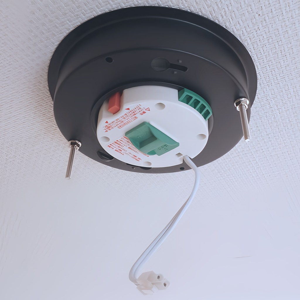 取り付けは二人がかりで行う方が楽ですが、一人の場合は片手で本体を天井に押し付けながら、もう片方の手でネジを留めます。1箇所留めると多少安定します。