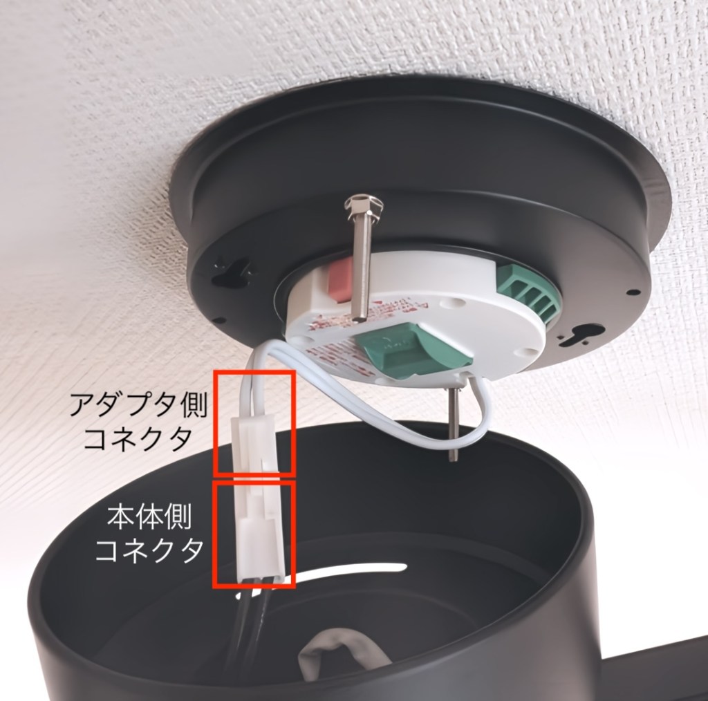 ペンダントライトを取り付けた様子。フランジカバー(黒いカップ)があるペンダントライトを取り付ければ変換プラグは隠れます。