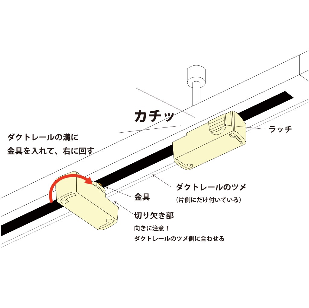 安易にスポットライトやプラグが外れないようにレールにはツメが付いており、変換プラグには取り付け方向があります。左写真のようにダクトレールのツメ側に変換プラグの切り欠き部が来るようにレールに90度(十文字)に当て、変換アダプタの金具をレールに入れてから90度回します。